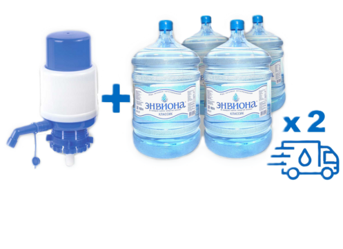 • Помпа (механическая или электрическая) • 2 тары 19 литров ПЭТ • 2 доставки по 2 бутыли 19 литров («Энвиона Классик» или «Энвиона Люкс»).